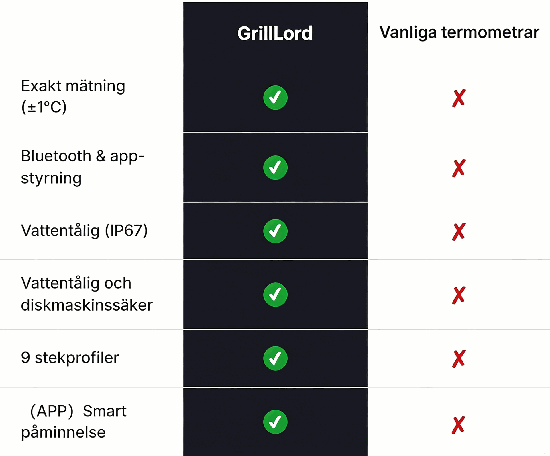 Högprecisionsmätning: 304 rostfritt stål-probe med mindre än ±1°C avvikelse, ger perfekt stekning av kött, fisk med mera.