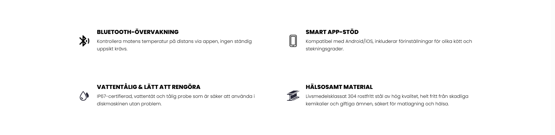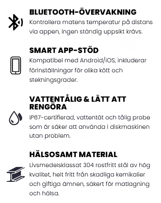 Smart app-stöd: Kompatibel med Android/iOS, inkluderar förinställningar för olika kött och stekningsgrader.